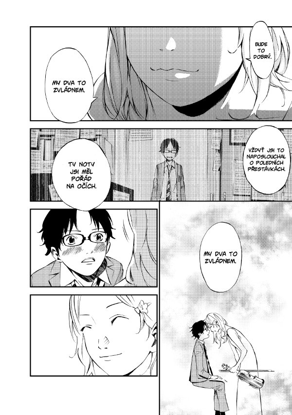Kósei Arima už nedokáže hrát na klavír, protože ztratil schopnost slyšet hudbu, ale na přání Kaori Mijazono se po dlouhé době vrací na pódium coby její doprovod při klavírní soutěži. Jenže jak doprovázet houslistku, která hraje jako splašená?